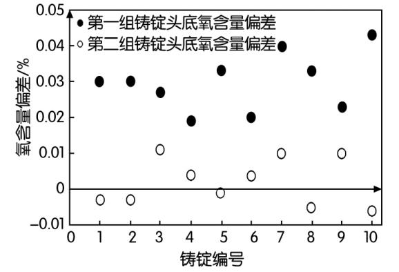 利用真空自耗電弧爐進行了大規格純鈦鑄錠的工業生產, 研究并分析 Ф1040 mm 大規格高氧含量純鈦鑄錠的底部脫氧現象和氧元素均勻性的問題。純鈦鑄錠底部脫氧的原因是海綿鈦中的 Mg 與添加劑 TiO2 在一次鑄錠熔煉時反應引起的。采用真空自耗電弧爐對梯度加氧自耗電極進行兩次熔煉,結果表明: 通過梯度加氧的方式可以有效解決純鈦鑄錠脫氧的問題,并顯著改善純鈦鑄錠氧元素成分均勻性,使生產出的 Ф1040 mm 高氧含量純鈦鑄錠頭部、尾部氧含量的偏差控制在0.011% 范圍內。