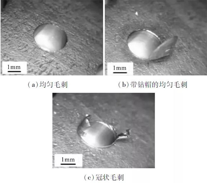 通過上述分析可知,鈦合金鉆削出口毛刺主要分為三類:均勻毛刺、帶鉆帽的均勻毛刺和冠狀毛刺,其形貌見圖1。由于鈦合金材料硬度高、導熱性差,導致加工時產生的出口毛刺形狀復雜。目前,針對鈦合金出口毛刺類型的分類還未有統一的標準。