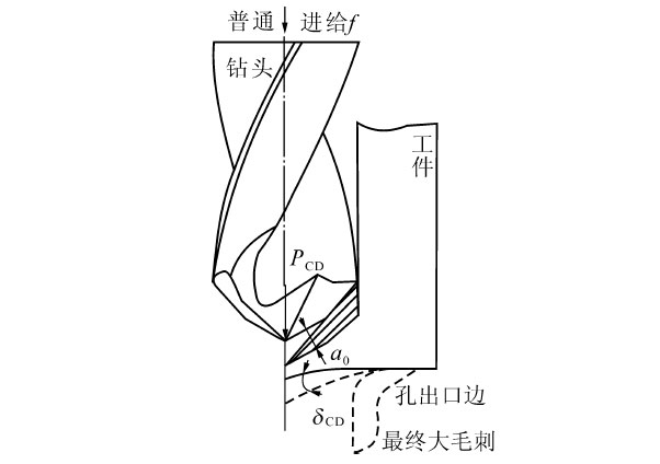 圖2為鉆削出口殘余材料變形及毛刺形成。綜上所述,出口毛刺的形狀主要取決于切削材料的撕裂位置和切削刃對殘余材料的切除效率。沿孔邊緣撕裂且切削效率高,則產生帶鉆帽的均勻毛刺;沿鉆頭中心撕裂且對殘余材料切除效率較低,則產生形狀不規則的冠狀毛刺。此外,在圍繞出口毛刺形成機理的有限元仿真研究中,建立的刀具模型具有一定的局限性,且建模過程忽略了刀具磨損和鉆削溫度對加工的影響,因此仿真模型缺乏準確性。