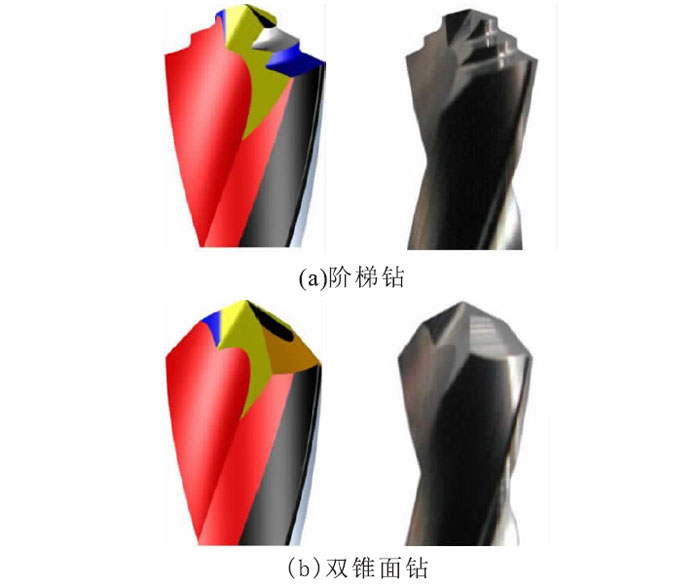 Li C.P.等采用不同材料和結構類型的鉆頭進行鈦合金鉆削試驗,結果表明,相比于麻花鉆,螺旋鉆因具有推力小、鉆頭長度短和頂角大等特點,鉆頭在離開工件時,切削刃能夠將出口周邊的材料有效切除,因此出口毛刺細小且均勻。Kim J.等在鉆削鈦合金材料時發現,鉆尖角的增大有助于減小出口毛刺的厚度和高度,而螺旋角的增大會導致出口毛刺尺寸的增加。李哲等采用了一種八面鉆新刃型刀具,八面鉆減小了橫刃寬度、主切削刃長度和主后刀面寬度,增加了第二后刀面,并且頂角從118°減至90°,從而減小了主后刀面長度,因此在鉆削鈦合金時比普通麻花鉆更易鉆入,有效降低了出口毛刺高度。Wei L.等研究了采用階梯鉆和雙錐鉆(見圖3)鉆削加工鈦合金材料的情況,仿真試驗對比結果表明,階梯鉆產生的推力較大,導致溫度過高,增加了材料的延展性,使其產生的出口毛刺大于雙錐鉆。
