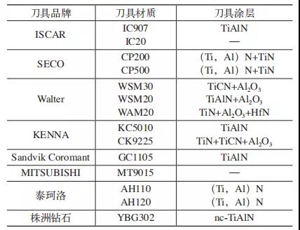 世界各大刀具廠商均推出了針對鈦合金零件加工的切削刀片。刀具材質(zhì)及涂層材料的不斷改良,提高了鈦合金材料的切削效率,推動了鈦合金工業(yè)的發(fā)展。伊斯卡(ISCAR)公司的IC20刀片切削鈦合金,刀具刃口鋒利,適合鈦合金工件的精加工。其IC907刀片有效提高了刀片的耐磨性,適合應(yīng)用于粗加工及半精加工中;山高(SECO)公司用于加工鈦合金的CP200及CP500,采用物理氣相沉積技術(shù),是一種高硬度超細(xì)顆粒的刀片材質(zhì);瓦爾特(Walter)公司的WSM30、WSM20及WAM20,采用TiCN、TiAlN、TiN與Al2O3涂層,刀具的抗變形、抗磨損能力較強(qiáng)。常用的鈦合金加工刀具及涂層見表1。