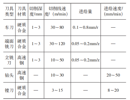 鈦合金進(jìn)給量選擇應(yīng)適中,若進(jìn)給量過小,加工時刀具在硬化層中切削,則磨損較快。進(jìn)給量可根據(jù)不同的刀具R進(jìn)行選擇,精加工一般選擇較小的進(jìn)給量,這是因為大進(jìn)給量切削會使刀具抗力增加,使刀具受熱彎曲或崩刃。表2為不同類型及材質(zhì)的刀具切削鈦合金時的常用參數(shù)。