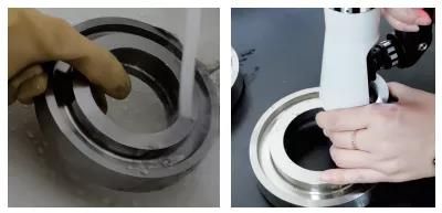 1)用氧化鋁砂布沿其長度方向折疊,牢固地插入拋光桿前端夾持槽內(nèi),并按照與旋桿旋轉(zhuǎn)方向相反的方向擰緊,每光飾一處工件表面后換一次新砂布(見圖6a)。