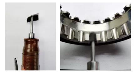 為了去除鈦合金壓氣機(jī)盤、輪轂、葉輪、軸和轉(zhuǎn)子隔圈的表面缺陷,提高零件的工作壽命,在對鈦合金工件完成所有的機(jī)械加工工序后,可采用手動蝶式光飾的方法,對工件表面進(jìn)行光飾加工。蝶式光飾需使用圖5所示光飾加工工具:旋轉(zhuǎn)氣槍(轉(zhuǎn)速18000r/min)、拋光桿、氧化鋁或碳化硅砂布(規(guī)格10mm×20mm、粒度120#)。
