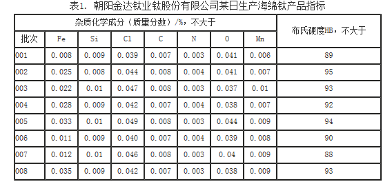 海綿鈦坨是硬而富有金屬韌性的金屬坨,將數噸重的金屬坨破碎到12.7mm以下的小顆粒海綿鈦,且在破碎過程中又不能發生氧化、氮化反應,不能帶入其他雜質,是一項難度很大的破碎技術,公司結合海綿鈦的有韌性、較硬、易氧化的特性,自主研發的破碎設備,海綿鈦顆粒均勻,疏松度較好,充裝密度小于1.25g/cm3;工藝參數的合理匹配,鈦坨較疏松,無硬芯,經過多級破碎僅有幾塊海綿鈦發生變色,經過分級挑選,一次檢驗,確保整批海綿鈦無氮化料、氧化料、異物,滿足航空小粒度要求;由表1可以看出Fe、O、N等雜質十分穩定,使用ICP抽檢Mn、Sn、Ni、Sb等雜質,確保海綿鈦其他雜質符合客戶要求。