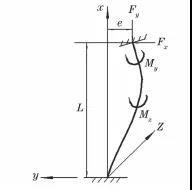 由圖1可以看出,在裝配好的螺桿鉆具中,由于馬達(dá)總成中心線與傳動(dòng)軸總成中心線不同軸,故有偏心距e的存在,撓性軸上端(轉(zhuǎn)子端)受軸向力Fy 、偏心力Fx 、撓性扭矩My 、彎矩Mz的作用,將My和Mz合并,稱為扭矩M。撓性軸下端(傳動(dòng)軸端)可以簡(jiǎn)化為固定端。