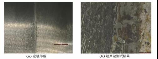 圖2 撓性軸印痕區(qū)域的宏觀形貌以及超聲波測(cè)試結(jié)果
