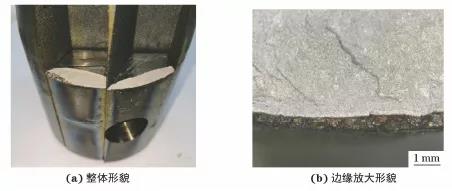 圖3 撓性軸印痕區(qū)域橫向斷口的整體形貌及邊緣放大形貌