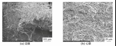 采用掃描電鏡對(duì)印痕區(qū)域橫向斷口的微觀形貌進(jìn)行觀察。由圖4可以看出:橫向斷口邊緣暗色區(qū)域磨損嚴(yán)重,可見(jiàn)疲勞特征;心部人為打開(kāi)的斷口表面平坦,塑性變形小,韌窩非常細(xì)小。