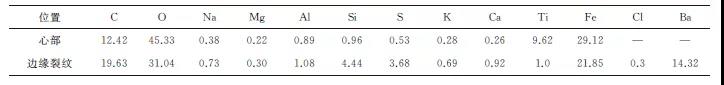 采用能譜儀(EDS)對(duì)印痕區(qū)域心部以及邊緣裂紋內(nèi)磨損產(chǎn)物的微區(qū)成分進(jìn)行分析。由表1可以看出:撓性軸印痕區(qū)域心部含有較高含量的氧、鐵、鈦元素,來(lái)源于與撓性軸對(duì)接的鋼質(zhì)接頭;裂紋內(nèi)的磨損產(chǎn)物含有大量碳、氧、鈀元素,來(lái)源于鉆井環(huán)境。