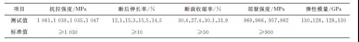 按照GB/T 228.1—2010,在撓性軸中間位置沿軸向截取拉伸試樣,在電子萬(wàn)能材料試驗(yàn)機(jī)上進(jìn)行室溫拉伸試驗(yàn)。由表2可以看出,撓性軸的拉伸性能滿足GB/T 2965—2007標(biāo)準(zhǔn)中的要求。