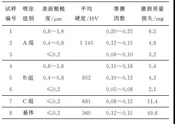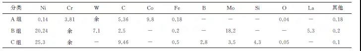 基體材料為α+β兩相鈦合金。噴涂粉體的組成如表4所示。其中:在A組粉體中添加了碳化鎢以提高涂覆層的硬度和耐磨性;B組粉體中除添加碳化鎢外還添加鉬和鑭元素,以使涂覆層具有耐磨減摩及自潤(rùn)滑性的特性;C組粉體為對(duì)照組,添加鉬元素但不添加碳化鎢,具有自潤(rùn)滑特性。