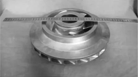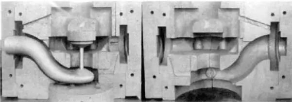 石墨本身強度較高、硬度低、易于加工,不僅在石墨芯的制備上難度低,而且在大型鑄件的空腔結(jié)構(gòu)成形用型芯的脫芯上,具有顯著的優(yōu)勢。圖3為某鈦合金泵體石墨型與石墨芯組型圖,可以看出在數(shù)控機床加工下,對于簡單曲面型內(nèi)腔,石墨芯完全可以滿足使用需求,特別是對于超大型鑄件大型芯的選用,石墨芯在脫芯工序中,相較于高溫焙燒后形成的陶瓷芯以及需要化學(xué)腐蝕或者機加工清除的金屬芯,石墨芯的機械力破壞脫除要方便得多,并且鈦合金鑄造用石墨大多為廢電極石墨,在生產(chǎn)成本上也具有優(yōu)勢。