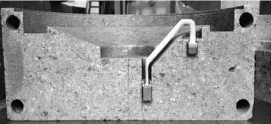 金屬芯常用的材料有鑄鐵、鑄鋼、鑄銅等,其主要特點為可以采用機加工結(jié)合焊接等成形方式,制備復(fù)雜程度高、壁厚小的型芯;金屬芯的熱導(dǎo)率要低于石墨芯,因此可以減緩型芯對金屬液的激冷作用。對于難以清理型芯的內(nèi)腔結(jié)構(gòu),金屬芯可以通過化學(xué)腐蝕脫芯的方法進行處理。圖2為金屬芯與石墨型組合圖。可以看出,金屬芯可以達到石墨芯無法實現(xiàn)的尺寸和形狀,而且在搬運、澆注過程中不易損壞,并且在常規(guī)機械力破壞脫芯法無法深入的鑄件孔腔內(nèi)部,可以通過化學(xué)腐蝕金屬芯來完成脫芯。但值得注意的是金屬芯在受熱后易發(fā)生膨脹,這不僅會對鑄件成形尺寸精度造成影響,而且金屬芯在化學(xué)腐蝕脫芯的過程中,也可能會由于長時間浸泡腐蝕液而對鑄件表面產(chǎn)生污染。因此在大尺寸型芯的選用上應(yīng)盡量避免采用金屬芯,減少金屬芯的蓄熱量及酸洗時間。除此之外, 金屬芯本身強度硬度高,在鑄件凝固收縮時無退讓性,容易在鑄件表面產(chǎn)生微裂紋。