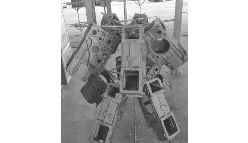 陶瓷芯的表面成形質(zhì)量在三種型芯中最高,根據(jù)陶瓷芯成形方法的不同可分為熱壓注成形、凝膠注模成形及3D打印陶瓷技術(shù)等,目前熱壓注成形技術(shù)應(yīng)用最為廣泛,后文將對新興的3D打印陶瓷芯進行闡述。傳統(tǒng)的熱壓鑄成形等方法制備陶瓷芯,離不開模具的制備,因此也限制了陶瓷芯的復(fù)雜程度。模具的制作成本較高,但是在批量生產(chǎn)中卻能夠顯著提高效率、壓縮成本。圖4為某發(fā)動機鑄件用陶瓷芯與石墨鑄型組型,該實心結(jié)構(gòu)的陶瓷芯在脫芯工藝上仍采用機械力破壞脫芯手段,但由于陶瓷高溫?zé)Y(jié)后強度硬度得到顯著提升,清理難度要略高于石墨芯。但在鑄件結(jié)構(gòu)允許的情況下,例如骨架類鑄件,可以采用中空薄壁狀陶瓷芯,這樣不僅可以節(jié)省原材料,還有利于后續(xù)鑄件脫芯。