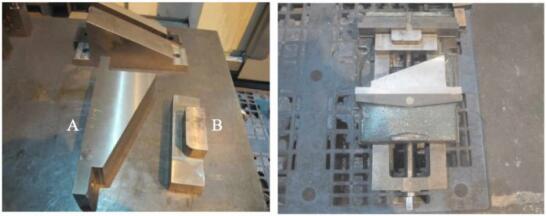 基于上述問題,從零件結構特點出發,設計了如圖 3 所示的舵芯批產通用組合工裝[4,5]。定位塊兩個面和舵芯兩個面相互貼合,夾具體底面和舵芯底面貼合從而實現舵芯的快速定位。舵芯的夾緊主要是通過楔形壓緊塊和固定塊共同完成的,通過定位銷將固定塊定位于夾具體上,并利用壓板完成固定塊的固定,將楔形壓緊塊沿固定塊導槽放入,楔形壓緊塊另一面和舵芯實現緊密貼合,通過螺栓和螺母將壓緊塊連接到夾具底座上。由于舵芯與楔形壓緊塊接觸面為斜面,受力分解得到三個方向的作用力,分別指向三個定位面,從而實現舵芯的壓緊。改進后的工裝見圖 4。