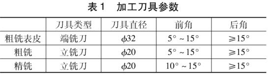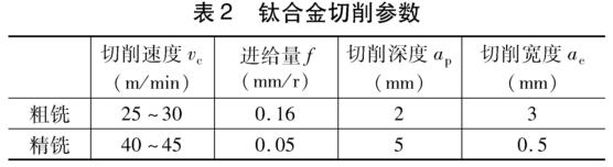 采用順銑可以最大限度降低加工切屑瘤對銑刀的破壞以及切屑與切削刃的焊合程度,使用大量水溶性油以及氣相亞硝胺型防銹液作為切削液可以達到較好的冷卻效果。考慮到零件內部的薄壁網格結構,切削過程中沖擊力較大時易產生振動造成打刀現象。經過多次試驗得到鈦合金切削參數見表 2。