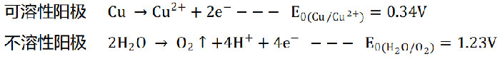 鈦陽(yáng)極作為不溶性陽(yáng)極,工作時(shí)陽(yáng)極反應(yīng)過(guò)程與可溶性陽(yáng)極(磷銅球)有顯著區(qū)別。以通常的析氧反應(yīng)為例,其化學(xué)反應(yīng)方程式如下: