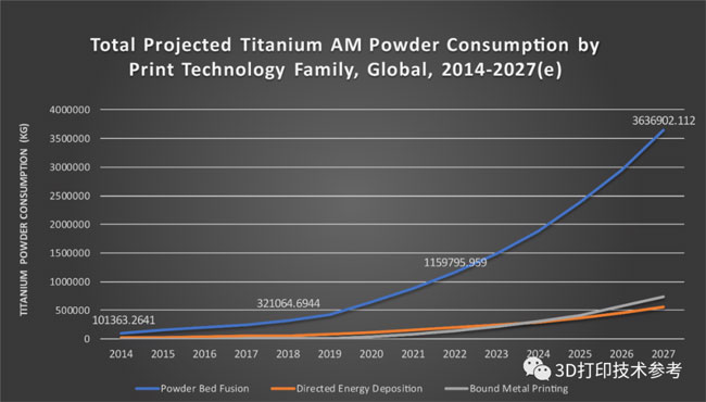 2014-2027年鈦合金3D打印粉末總消耗量預測(來源:SmarTech)