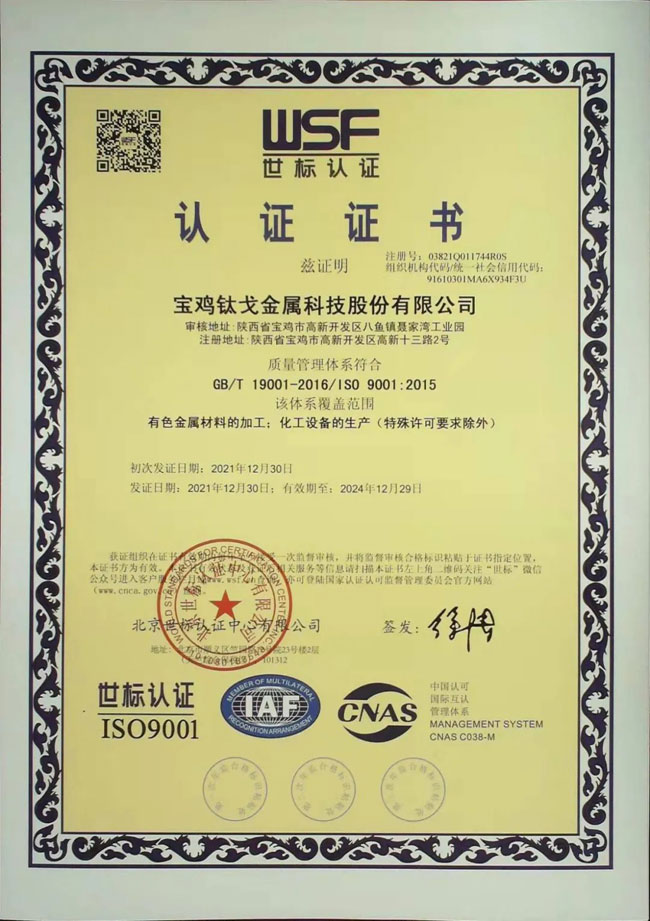 2021年12月30日,臨近年末,寶雞鈦戈金屬科技股份有限公司傳來喜訊,經北京世標認證中心審核,公司質量管理體系符合GB/T19001/ISO9001標準要求,簽發了質量管理體系認證證書,同時經三公資信評估的企業信用AAA等級證書也于當日頒發。一天收到兩份喜報,對鈦戈金屬全體員工來說,是莫大的鼓舞,也驗證了公司這一年來從上至下狠抓質量、提升服務的成效。標志著公司在制度化、規范化管理方面邁上新臺階。