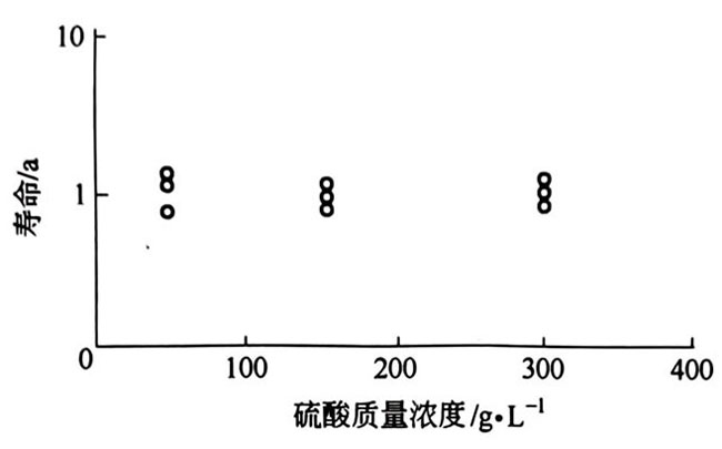 從圖4-1可見,硫酸質(zhì)量濃度范圍在1~300g/L時,鈦電極強化壽命幾乎不受硫酸質(zhì)量濃度的影響。
