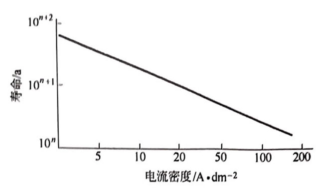 (3)與電流密度的關(guān)系。強化壽命試驗條件:H2SO4 150g/L,60℃,電流密度范圍 0.01A-3A/cm2時,鈦陽極強化壽命與電流密度呈反比密度呈反比(見圖4-3)。