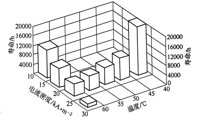 電流密度為1A/cm2時,強化壽命為12000h,而電流密度提高至2A/cm2時,強化壽命為4000h,降至1/3。電流密度對電極壽命影響也很大。