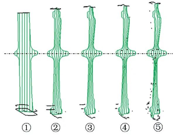 針對帶阻尼臺葉片鍛造過程出現(xiàn)折疊問題,對原始葉片毛坯進(jìn)行優(yōu)化,⑴增大榫頭及阻尼臺過渡圓角;⑵對葉片毛坯開展葉片頂鍛制坯+榫頭及阻尼臺采用頂鍛模夾扁。圖5 為優(yōu)化后葉片成形過程及載荷,圖5 ①為鍛造初始狀態(tài),帶阻尼臺葉片鍛造最大行程71.6mm,為優(yōu)化前94%,最大載荷1796 噸,為優(yōu)化前71%,鍛造過程無折疊等缺陷產(chǎn)生。由圖可知,優(yōu)化后阻尼臺葉片鍛造過程發(fā)生了很大變化,在行程為61.2mm 時(圖5 ②),葉片阻尼臺區(qū)域基本成形;行程為66.8mm 時(圖5 ③),葉片小端基本成形;行程為69.4mm 時(圖5 ④)葉片榫頭基本成形;行程為71.6mm 時(圖5 ⑤),零件完全成形,成形后零件飛邊均勻。圖6 為優(yōu)化后葉片橫截面在鍛造過程中流線分布變化過程,由圖可知葉片流線分布較為合理。