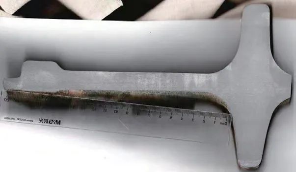 TC6 鈦合金帶阻尼臺葉片鍛造過程在1600t 等溫鍛液壓機(jī)上進(jìn)行,鍛后葉片金相組織如圖7 所示為等軸組織,鍛件截面圖如圖8 所示,葉片內(nèi)部流線清晰,無明顯缺陷。成形葉片室溫抗拉強(qiáng)度為1193MPa,伸長率12.5%,斷面收縮率42%,沖擊韌性38J/cm2,400℃高溫抗拉強(qiáng)度899MPa,各項(xiàng)理化檢驗(yàn)指標(biāo)均符合設(shè)計(jì)要求。