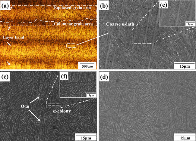 激光增材制造Ti60鈦合金近等軸晶組織的主要特征是交替出現的短棒狀柱狀晶和細小等軸晶,柱狀晶的外延生長被限制在相鄰熔覆層之間,平均晶粒尺寸為80.3 μm。此外,激光增材制造過程中獨特的熱循環導致了層帶結構的形成,且層帶結構同時包含粗大的初始α板條和細小的二次α板條。