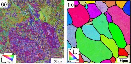 圖2 EBSD測試結果(a)及初始β晶粒的重構(b)