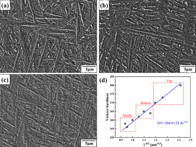 (a)底部;(b)中部;(c)頂部;(d)α板條寬度和維氏硬度之間的關系