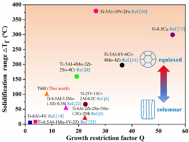 圖7 不同類型鈦合金的凝固溫度區間和生長抑制因子及其對應的晶粒特征