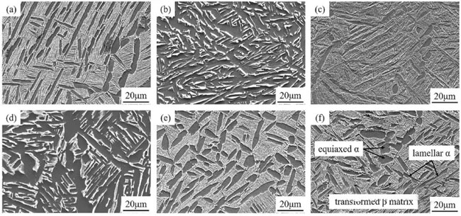 圖2為不同熱處理狀態下TA15合金的顯微組織。在970°C保溫1.5h后空冷(AC),TA15合金的顯微組織由少量等軸α晶粒、大量層狀α和β轉變組織組成。而在970°C保溫1.5h后爐冷(FC),顯微組織則由大量等軸或短棒狀α、少量層狀α和β轉變組織組成。以及當冷卻方式為水淬(WQ)時,合金的顯微組織由少量殘余初生等軸α、細片狀α和馬氏體α'組成。也就是說,隨著第一階段熱處理的冷卻速率的增加,等軸α相的體積分數和平均粒徑減小,同時層狀α體積分數增加、平均寬度減小,β轉變組織的體積分數變化不大。此外,通過在970°C/2 h/WQ+930 °C/3 h/AC+600 °C/4 h/AC熱處理后,調控出了包含等軸α、層狀α和β轉變組織的典型三模態組織,如圖2(f)所示。在該種熱處理制度下,合金的顯微組織由17%的等軸α、48%的層狀α以及35%的β轉變組織組成。