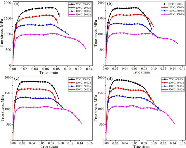 圖1不同溫度和應變率下的激光選區熔化Ti-6Al-4V合金的動態應力-應變曲線。