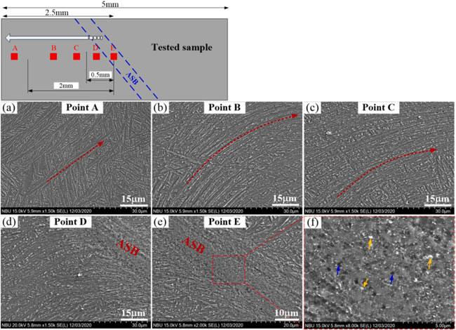 圖2 650℃/6000s-1加載條件下激光選區熔化Ti-6Al-4V合金試樣中的微觀組織形貌。(a)未變形區,(b,c) 中等變形區,(d)重度變形區,(e,f) 絕熱剪切帶及其內部形貌。