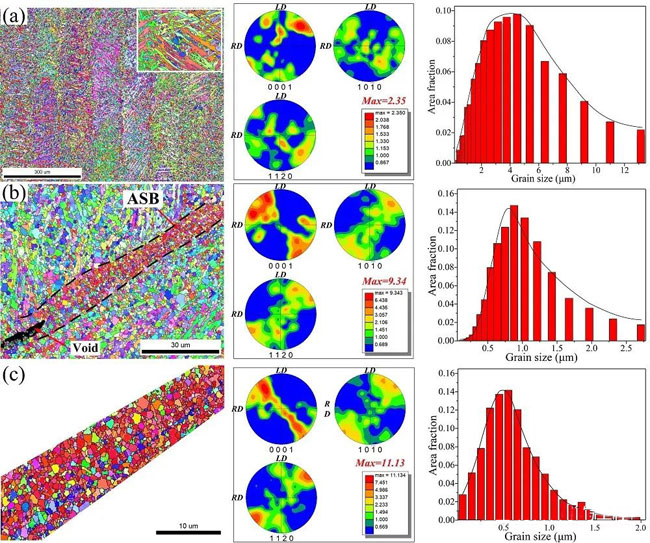 圖3高溫高應變率加載條件下的晶粒形貌、織構和晶粒尺寸統計圖。(a)未加載材料,(b)650℃/6000s-1條件下,(c) 剪切帶內。