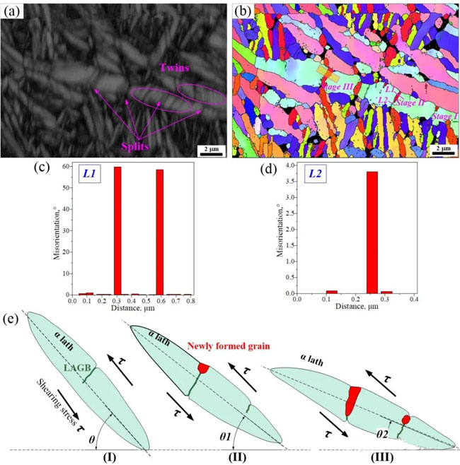 研究發現,與傳統鈦合金(軋制、鑄造等)不同,增材制造TC4合金中主要以細小的板條狀馬氏體為主。在沖擊載荷下,微觀組織的演變機理除了有動態再結晶,還有變形孿晶伴生的α板條橫向斷裂機理。其過程分析如下:原始態的板條軸線近似平行于剪切方向,垂直于板條縱軸形成一簇LAGB。在沖擊載荷的作用下,板條在LAGB的末端開始收縮。隨著變形的進行,LAGB的取向差增大,更多的位錯形成、堆積,部分位錯轉變為變形孿晶。LAGB逐漸擴展直至貫穿整個板條。同時,板條軸線傾斜,使其更加垂直于加載方向,如階段II所示。在第III階段,板條傾斜加劇,變形孿晶沿著LAGB繼續生長,直到板條被穿透,從而導致板條橫向斷裂。(文:LY)