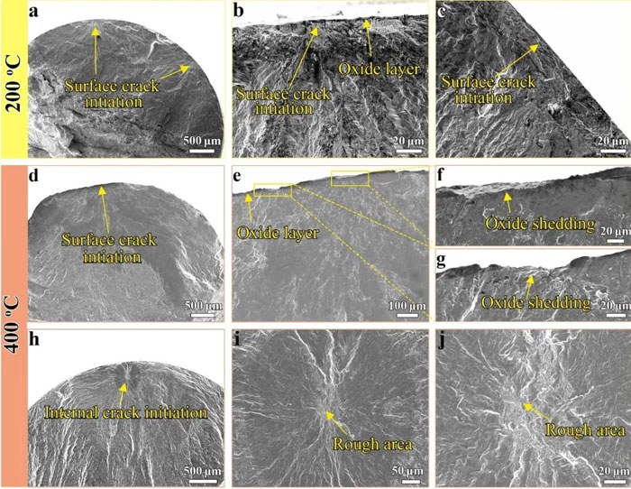 a-c: 氧化物入侵誘導(dǎo)的表面裂紋萌生 (200℃,σa=650MPa,R=-1,Nf=2.7×104cyc),b和c分別是a中上面和右側(cè)裂紋萌生區(qū)域的放大圖;d-g: 氧化物脫落誘導(dǎo)的表面裂紋萌生 (400℃,σa=520MPa,R=-1,Nf=7.6×105cyc),e是d中裂紋萌生區(qū)域的放大圖,f和g分別是e中相應(yīng)區(qū)域的放大圖;h-j: 內(nèi)部裂紋萌生 (400℃,σa=520MPa,R=-1,Nf=1.0×106cyc),i和j分別是h和i中裂紋萌生區(qū)域的放大圖
