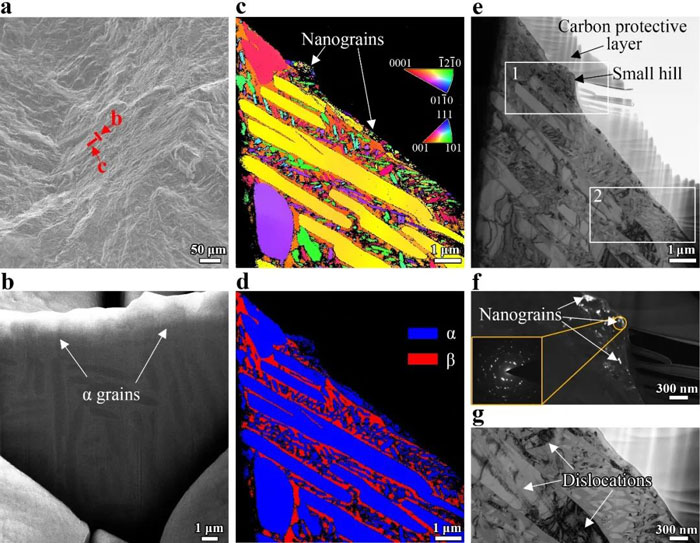 a: SEM圖像,短線為提取位置;b: a中位置b沿主應(yīng)力方向剖面SEM觀測結(jié)果;c-e: a中位置c沿主應(yīng)力方向剖面的反極圖、相圖和TEM圖片;f和g: 分別為e中區(qū)域1的暗場像和區(qū)域2的放大圖。