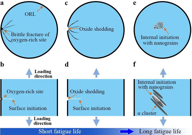 力學(xué)所非線性力學(xué)國家重點(diǎn)實(shí)驗(yàn)室微結(jié)構(gòu)計算力學(xué)課題組,研究揭示航空發(fā)動機(jī)葉片用TC17鈦合金高溫 (200℃和400℃) 高周疲勞裂紋起源于試樣表面或內(nèi)部 (圖1),表面裂紋萌生是由于富氧層開裂或氧化物脫落導(dǎo)致的 (圖1a-1g),內(nèi)部裂紋萌生是位錯相互作用導(dǎo)致晶粒細(xì)化進(jìn)而誘導(dǎo)的 (圖2)。在實(shí)驗(yàn)結(jié)果基礎(chǔ)上,提出400℃時TC17鈦合金表面裂紋萌生和內(nèi)部裂紋萌生競爭模型 (圖3)。