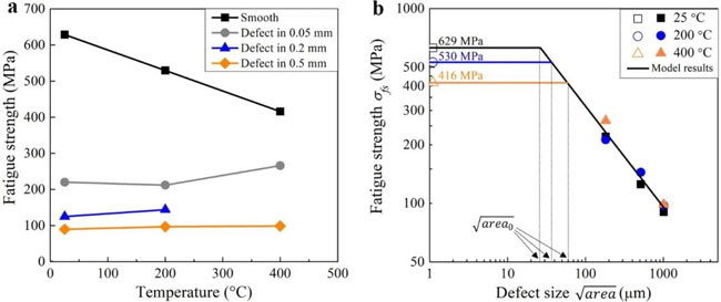 a: 光滑試樣和缺陷試樣疲勞強(qiáng)度 (2×107cyc) 與溫度之間關(guān)系;b: 高溫和缺陷對TC17鈦合金超高周 (2×107cyc) 疲勞強(qiáng)度的影響模型與實(shí)驗(yàn)數(shù)據(jù)比較,空心符號表示光滑試樣的疲勞強(qiáng)度。這里應(yīng)力均為名義應(yīng)力,計算截面為試樣最小截面。