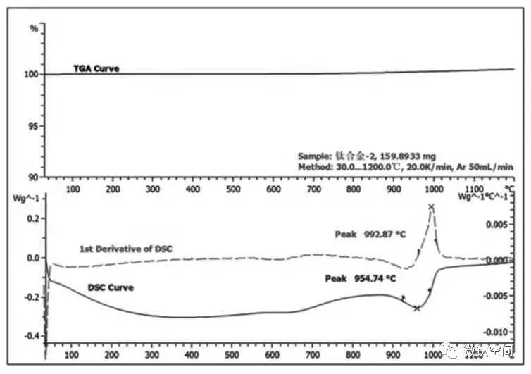 TA15鈦合金名義成分為Ti-6Al-2Zr-1Mo-1V,是一種近α鈦合金。圖2為TA15鈦合金的TGA/DSC測試曲線。同樣,在測試范圍內TG重量基本沒有變化,因此樣品在整個過程中沒有發生氧化反應。由DSC曲線可以看出,在500℃前的DSC曲線明顯向下彎曲也呈現放熱現象,應也是由樣品釋放殘余應力引起的;而在700℃以后,有明顯的向吸熱方向偏移,出現吸熱峰,約在1020℃左右結束。圖2也給出了DSC曲線的一階導數,曲線上有明顯的峰,峰值為992.87℃,同理可推斷TA15鈦合金的相變溫度為992.87℃。