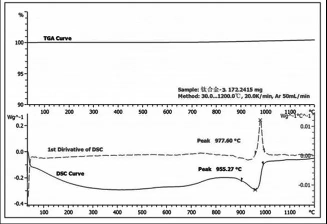 TC4鈦合金名義成分為Ti-6Al-4V,是最為常用的α+β鈦合金之一。圖3為TC4鈦合金的TGA/DSC測試曲線。同樣,在測試范圍內TG重量基本沒有變化,因此樣品在整個過程中沒有發生氧化反應。由DSC曲線可以看出,在500℃前的DSC曲線明顯向下彎曲也呈現放熱現象,應也是由樣品釋放殘余應力引起的;而在700℃以后,有明顯的向吸熱方向偏移,出現吸熱峰,約在1020℃左右結束。圖3也給出了DSC曲線的一階導數,曲線上有明顯的峰,峰值為977.60℃,同理可推斷TC4鈦合金的相變溫度為977.60℃。