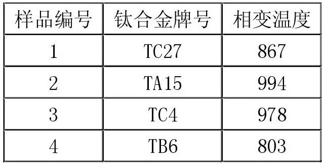 實驗所用的儀器為METTLER公司的TGA/DSC3/1600LF至尊型同步熱分析儀,可使用溫度范圍為:室溫~1600℃。實驗所用的樣品是分別從四種不同鈦合金TC27、TA15、TC4、TB6棒材上切取φ6mm×1~2mm的小圓柱。樣品編號及相變溫度如表1所示。實驗過程中使用容積為150μL的鉑金坩堝,升溫速率20℃/min,高純Ar氣保護50mL/min,實驗溫度為30~1200℃。利用同步熱分析儀得到四種不同鈦合金在升溫過程的TGA/DSC曲線,通過曲線分析出四種不同鈦合金的相變溫度。