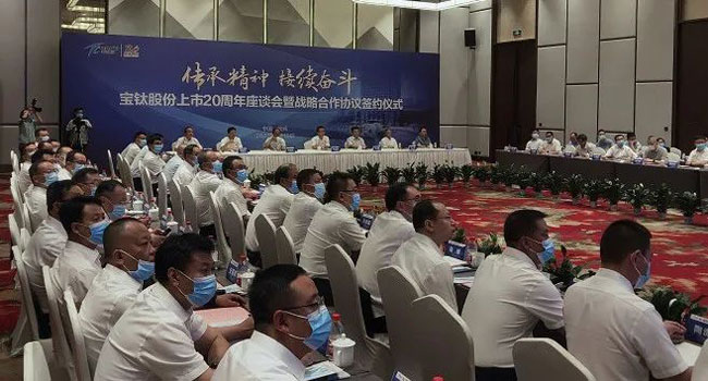 6月16日,寶鈦股份上市20周年座談會暨戰略合作協議簽約儀式在寶雞舉行。原寶鈦集團董事長、中國有色金屬工業協會鈦鋯鉿分會會長王文生以及在陜西的老領導顏學柏等人參加了座談會,航發動力等客戶前來祝賀寶鈦股份上市20周年。