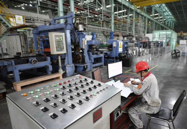 5月28日,湖南湘投金天科技集團(以下簡稱“湘投金天”)旗下金天鈦金冷軋鈦帶卷制造車間,一臺冷軋鈦帶卷專用二十軸軋機正在穩定工作。