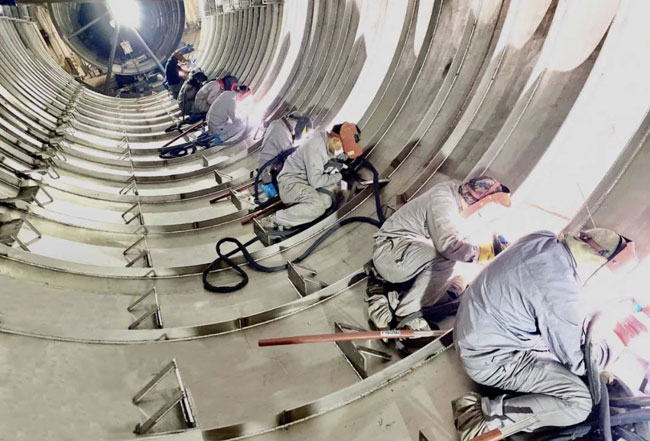 本項目包括塔器、換熱器等成套設備15臺套,材質均為哈氏合金C-276。其中共沸精餾塔規格為φ4800*49800mm,重量近200噸;第一再沸器、第二再沸器規格為φ2100*8976mm,單臺重量近60噸,具有規格大,制造難度高等特點。為確保項目生產進度,東方鈦業上下團結一心、緊密安排部署、克服疫情帶來的不利影響, 加快推進項目進程。充分發揮技術優勢,從開發設計、材料采購、生產制造、質量管控等多個維度切入,扎實做好各項工作,秉承“精心、精益、精品”的生產理念,急用戶之所急,想用戶之所想,解客戶之所憂 。各級領導駐扎生產一線,既督戰又參戰,與一線人員連續數天24小時倒班作業,晝夜趕工,確保設備生產進度和質量,保障了客戶按期安裝,圓滿完成了本次任務。用實際行動踐行了我司“一切為了客戶,為了一切客戶,為了客戶一切”的客戶理念。