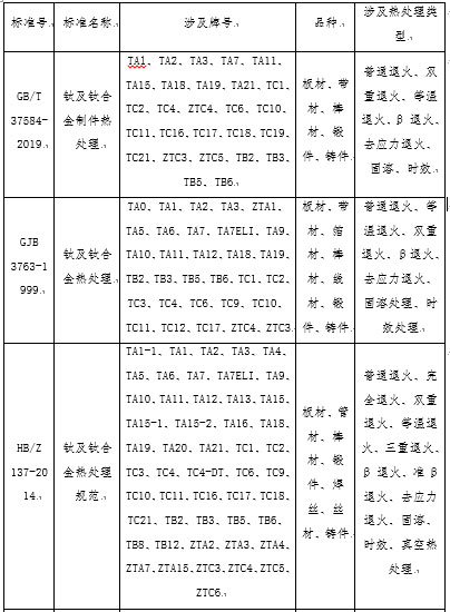 我國(guó)鈦及鈦合金熱處理專用標(biāo)準(zhǔn)包含1項(xiàng)國(guó)家標(biāo)準(zhǔn)、1項(xiàng)國(guó)家軍用標(biāo)準(zhǔn)和3項(xiàng)行業(yè)標(biāo)準(zhǔn),標(biāo)準(zhǔn)中包含的材料牌號(hào)、品種、熱處理方式見(jiàn)表1。標(biāo)準(zhǔn)中規(guī)定了部分常用鈦合金牌號(hào)的熱處理制度、設(shè)備、工藝與質(zhì)量控制等相關(guān)要求。