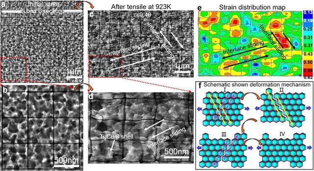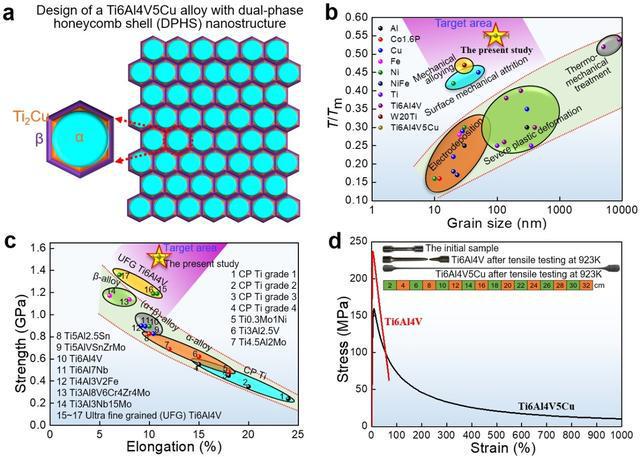 圖1 雙相蜂窩殼結構納米晶Ti6Al4V5Cu合金的組織設計與性能,(a)組織設計示意圖;(b)失穩溫度-晶粒尺寸圖,顯示材料具有良好的組織熱穩定性;(c)室溫強度-延伸率圖,相較于其它鈦合金,材料具有良好的強塑性匹配;(d)650℃/0.01s-1條件下的拉伸應力-應變曲線,材料的延伸率超過1000%。